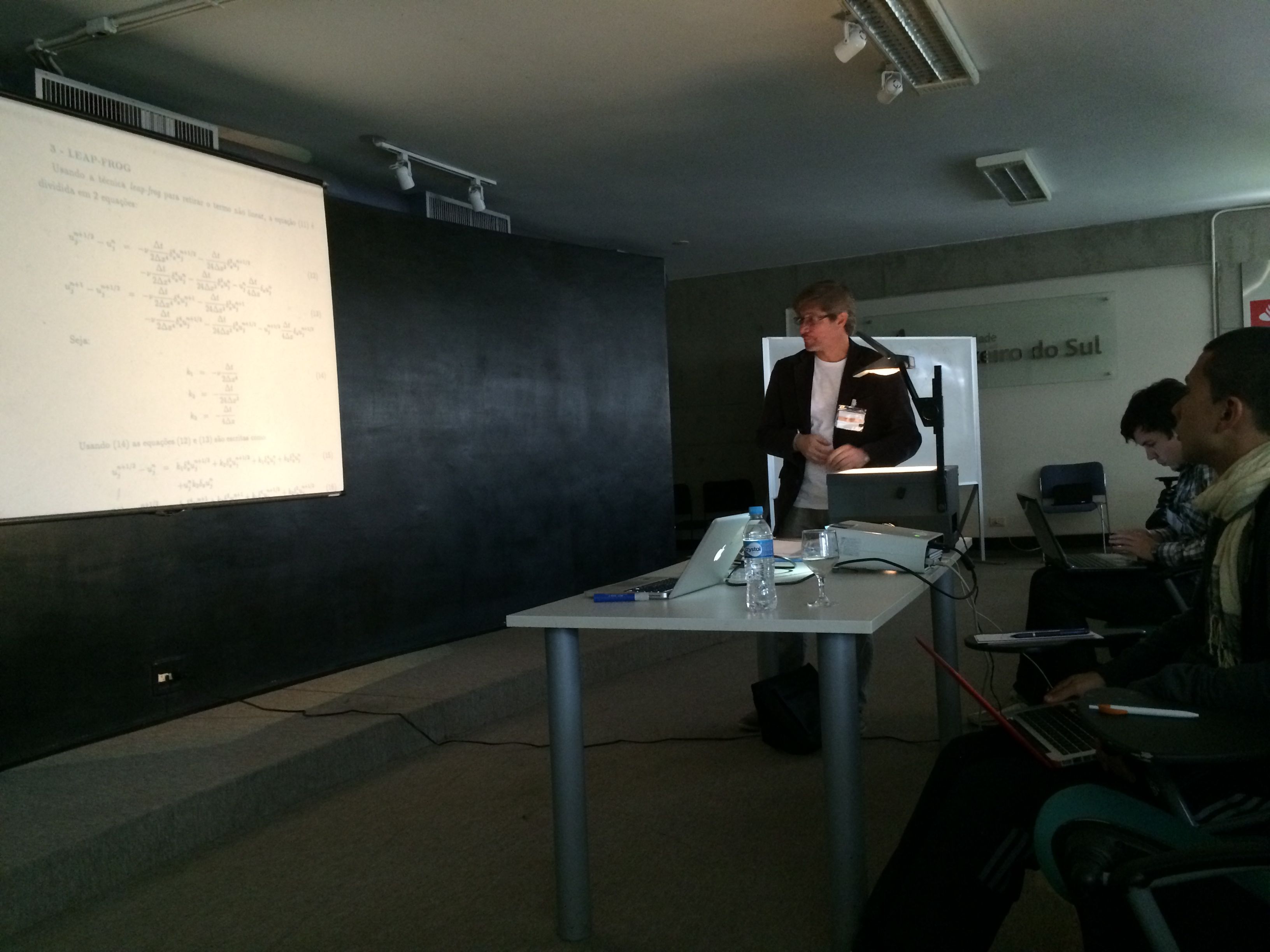 Reinaldo Rosa (INPE) spoke about numerical methods for cosmological simulations, starting with methods for solving hydrodynamics. He even used, at some point, an old-fashioned — some would call vintage — slide projector to describe how diffusion arises from the Navier-Stokes equation.